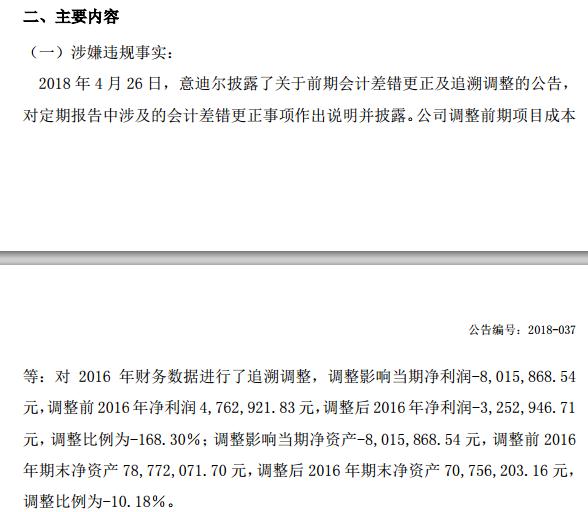 2018年4月26日,意迪爾披露了關于前期會計差錯更正及追溯調(diào)整的公告, 對定期報告中涉及的會計差錯更正事項作出說明并披露,公司調(diào)整前期項目成本等。