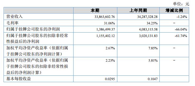 報告期內公司實現(xiàn)營業(yè)收入3386.36萬元,較上年同期下降1.24%;營業(yè)成本為2334.62萬元,較上年同期增加3.56%;實現(xiàn)利潤總額108.43萬元,較上年同期下降75.90%;實現(xiàn)凈利潤106.44萬元,較上年同期下降72.00%,歸屬于掛牌公司股東的凈利潤為138.65萬元,較上年同期下降66.04%。?