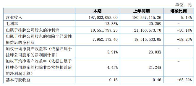 報告期內(nèi),公司實現(xiàn)營業(yè)收入19,703.31萬元,較上年同期增長9.13%;公司實現(xiàn)凈利潤1,055.18萬元,較上年同期下降50.14%?。