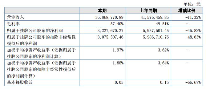 報告期內,公司實現營業(yè)收入3,686.87萬元,同比降低11.32%;實現歸屬掛牌公司股東的凈利潤322.77萬元,同比降低45.82%。?