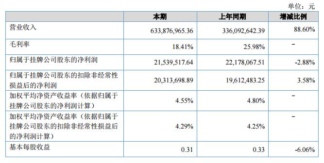 報(bào)告期內(nèi)公司營(yíng)業(yè)收入633,876,965.36元,2017年上半年?duì)I業(yè)收入336,092,642.39元,同比增長(zhǎng)88.60%;凈利潤(rùn)21,149,148.89元,2017年上半年凈利潤(rùn)21,677,213.80元,同比下降2.44%?。