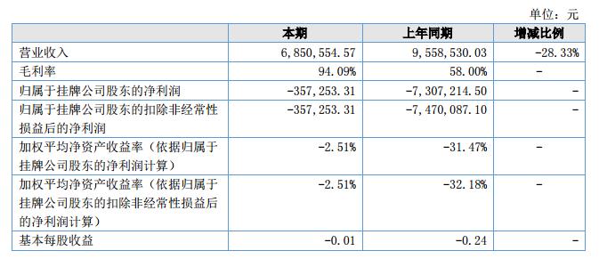報(bào)告期內(nèi),公司實(shí)現(xiàn)營(yíng)業(yè)收入約685.06萬(wàn)元,較去年同期下降28.33%,公司實(shí)現(xiàn)歸屬于母公司所有者的凈利潤(rùn)約-35.73萬(wàn)元,較去年同期虧減695萬(wàn)元。?