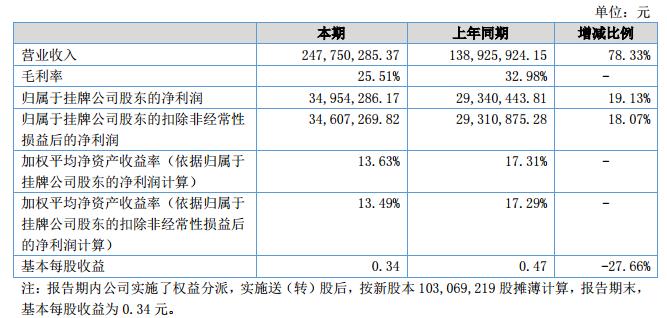 報告期內,公司實現(xiàn)營業(yè)收入24,775.03萬元,同比增加10,882.44萬元,增長78.33%;實現(xiàn)利潤總額4,113.59萬元,同比增加645.50萬元,增長18.61%;實現(xiàn)凈利潤3,495.43萬元,同比增加561.38萬元,增長19.13%。?