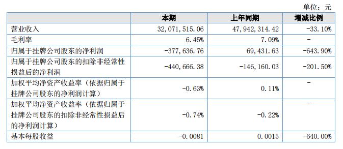 報告期內(nèi),公司實現(xiàn)營業(yè)收入3,207.15萬元,同比減少33.10%;毛利率為6.45%,凈利潤-37.76萬元,較上年同期下降643.90%。