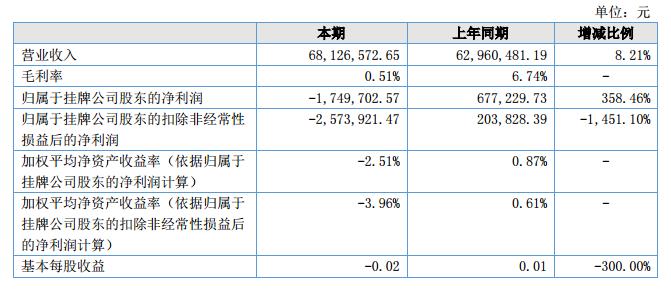 報告期內(nèi),公司實現(xiàn)營業(yè)收入68,126,572.65元,較去年增長8.21%,其中燃料油銷售收入63,348,951.71元,占總收入92.99%;凈利潤虧損1,749,702.57元,較上年增加虧損2,426,932.30元。?
