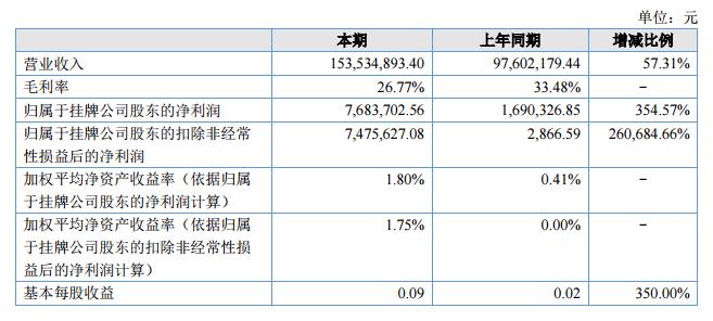 報(bào)告期內(nèi),公司實(shí)現(xiàn)營(yíng)業(yè)收入153,534,893.40元,同期增加57.31%;達(dá)成歸屬于掛牌公司股東的凈利潤(rùn)7,683,702.56元,同期增長(zhǎng)354.57%。?