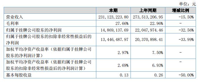 報告期內(nèi),公司實現(xiàn)營業(yè)總收入23112.32萬元,較上年同期下降15.50%;公司營業(yè)總成本20894.95萬元,較上年同期下降15.89%,;公司實現(xiàn)凈利潤1806.66萬元,較上年同期下降20.04%。?