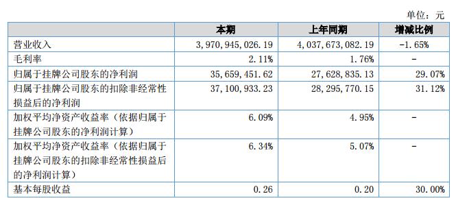 公司本期實(shí)現(xiàn)營(yíng)業(yè)收入397,094.50萬元,同比減少1.65%;本期發(fā)生營(yíng)業(yè)成本388,698.72萬元,同比減少2.01%;公司本期歸屬于母公司所有者的凈利潤(rùn)為3,565.95萬元,較上年同期增加803.06萬元,同比增長(zhǎng)29.07%。?