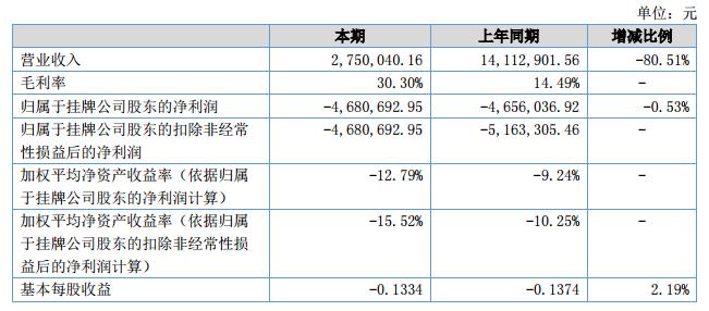 報(bào)告期內(nèi)公司實(shí)現(xiàn)營(yíng)業(yè)收入275萬(wàn)元,比上年同期下降80.5%;報(bào)告期內(nèi)公司實(shí)現(xiàn)的凈利潤(rùn)為-468.07萬(wàn)元,與上年同期基本持平。?