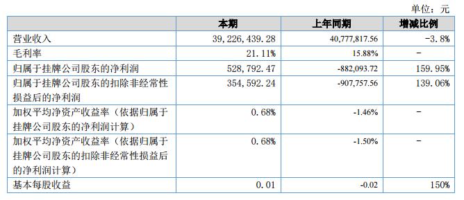 報(bào)告期內(nèi),公司實(shí)現(xiàn)營業(yè)收入39,226,439.28元,較上年同期減少1,551,378.28元,實(shí)現(xiàn)歸屬于母公司股東凈利潤528,792.47元,比去年同期增加1,410,886.19元。?