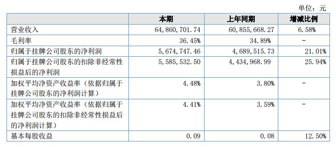 經(jīng)營成果:報(bào)告期內(nèi),公司實(shí)現(xiàn)營業(yè)收入64,860,701.74元,同比增長(zhǎng)6.58%;營業(yè)成本41,218,560.66,同比增長(zhǎng)4.03%;實(shí)現(xiàn)凈利潤(rùn)5,669,391.58元,同比增長(zhǎng)20.62%。?