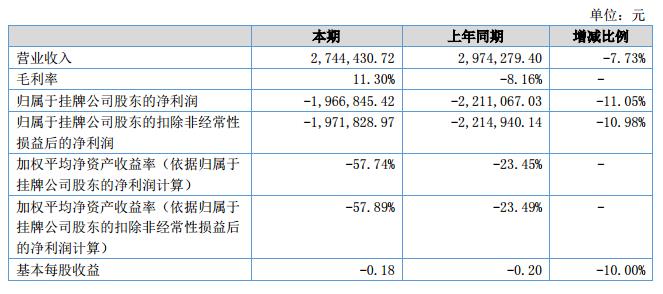 報告期內公司主營業(yè)務收入為2,744,430.72元,比去年同期下降7.73%;營業(yè)成本為2,434,290.86元,比去年同期下降24.33%;歸屬母公司的凈利潤為-1,966,845.42元,比上年同期凈利潤-2,211,067.03元虧損金額減少了11.05%?