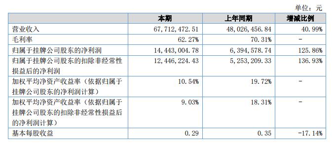 報(bào)告期內(nèi),公司實(shí)現(xiàn)營(yíng)業(yè)收入6771.25萬(wàn)元,較去年同期增長(zhǎng)40.99%;告期內(nèi),公司實(shí)現(xiàn)歸屬于掛牌公司的凈利潤(rùn)1444.30萬(wàn)元,較去年同期增長(zhǎng)125.86%。