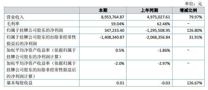 報(bào)告期內(nèi)公司完成營(yíng)業(yè)收入895.38萬(wàn)元,同比增長(zhǎng)79.97%;營(yíng)業(yè)成本366.79萬(wàn)元,凈利潤(rùn)31.08萬(wàn)元,同比增長(zhǎng)123.6%;經(jīng)營(yíng)活動(dòng)產(chǎn)生的現(xiàn)金流量?jī)纛~-296.23萬(wàn)元。?