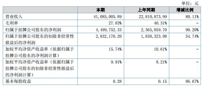 報(bào)告期內(nèi)公司營(yíng)業(yè)收入增長(zhǎng)80.11%,增加凈額1,827.41萬(wàn)元;歸屬于母公司凈資產(chǎn)為2,784.03萬(wàn)元,較期初增長(zhǎng)5.69%,增加凈額149.98萬(wàn)元。