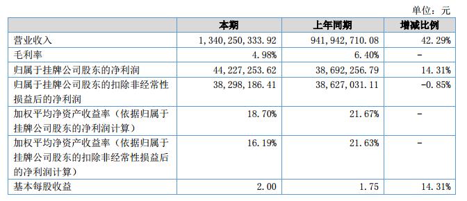 報告期內(nèi),公司實(shí)現(xiàn)營業(yè)收入134,025.03萬元,同比增長42.29%;營業(yè)成本127,345.76萬元,同比增長44.43%;營業(yè)利潤5,833.41萬元,同比增長14.97%,歸屬于掛牌公司股東的凈利潤4,422.73萬元,同比增長14.31%?