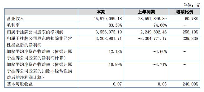 報(bào)告期內(nèi),公司實(shí)現(xiàn)營(yíng)業(yè)收入45,970,099.18元,相比同期增長(zhǎng)60.78%。截至報(bào)告期末,公司資產(chǎn)總額68,003,751.68元,較期初減少2.76%;歸屬于母公司所有者權(quán)益合計(jì)30,977,279.97元,較期初增長(zhǎng)12.97%。?