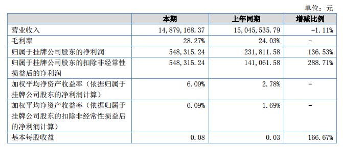 報告期內(nèi),公司實現(xiàn)營業(yè)收入14,879,168.37元,實現(xiàn)凈利潤548,315.24元,較上年增長136.53%;毛利率28.27%,較上年同期有所增長。?