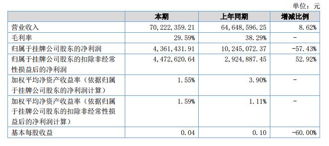 報告期內(nèi)公司營業(yè)收入70,222,359.21元,比去年同期的64,648,596.25元,增長了8.62%;公司凈利潤3,693,998.78元,比去年同期的9,997,571.82元,下降了63.05%。