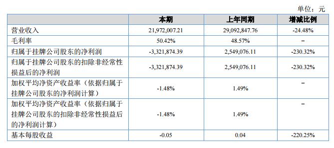 報(bào)告期內(nèi),公司營(yíng)業(yè)收入為21,972,007.21元,較上年同期減少7,120,840.55元;報(bào)告期內(nèi)累計(jì)實(shí)現(xiàn)凈利潤(rùn)-3,518,861.21元,較上年同期減少6,067,937.32元。?