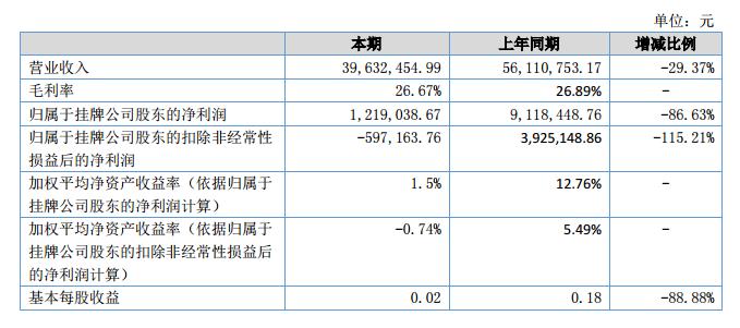 報告期內(nèi)公司實(shí)現(xiàn)營業(yè)收入3,963.24萬元,比去年同期減少了1,647.83萬元,同比下降29.37%;凈利潤1,219,038.67萬元,較去年同期減少了789.94元,同比下降86.63%。