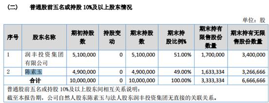 資料顯示,,公司股東為潤(rùn)豐投資集團(tuán)有限公司和自然人陳素玉。潤(rùn)豐投資集團(tuán)有限公司持股51%,自然人股東陳素玉持股49%,自然人股東陳素玉與潤(rùn)豐投資集團(tuán)有限公司全體自然人六名股東簽訂 了《一致行動(dòng)協(xié)議》,以上七人為公司實(shí)際控制人,持股比例合計(jì)為100%,處于絕對(duì)控股地位。
