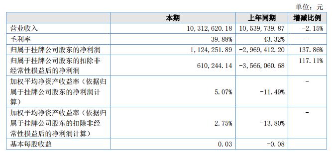 報(bào)告期內(nèi),公司實(shí)現(xiàn)營業(yè)收入10,312,620.18元,歸屬母公司凈利潤1,124,251.89元,同比增加137.86%?