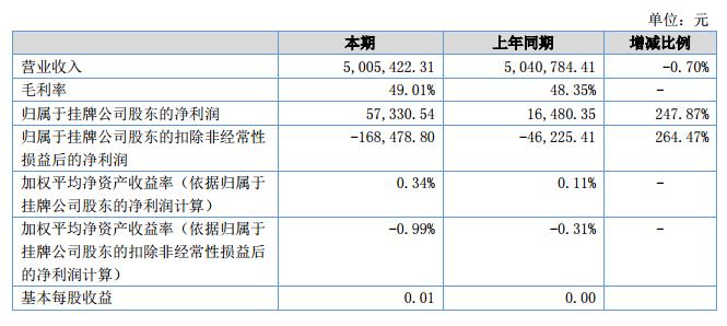 報告期內(nèi),公司實現(xiàn)營業(yè)收入5,005,422.31元,與上年同期基本持平;利潤總額為152,994.08元,凈利潤為57,330.54元,較上年同期均有增長。?