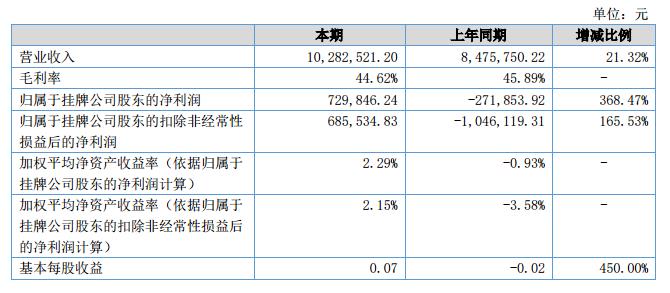 報告期內實現(xiàn)營業(yè)收入10,282,521.20元,較上年同期增長21.32%;實現(xiàn)營業(yè)凈利潤為729,846.24元,較上年同期增長368.47%。