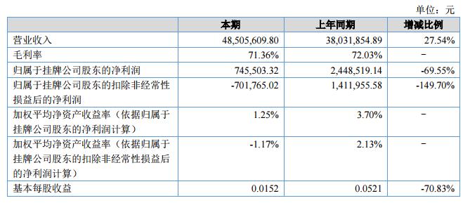 報告期內(nèi),公司實現(xiàn)營業(yè)收入4,850.56萬元,同比增長27.54%;公司合并報表歸屬于母公司的凈利潤為74.55萬元,同比下降69.55%?。