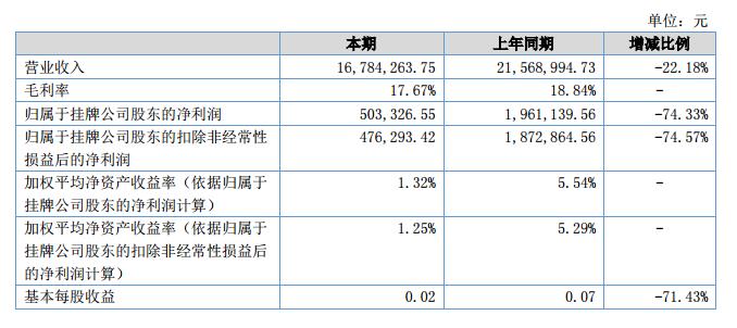 報告期內(nèi)公司實現(xiàn)營業(yè)收入16,784,263.75元,較去年同期收入21,568,994.73元,下降22.18%;實現(xiàn)凈利潤503,326.55元,較去年同期下降74.33%。