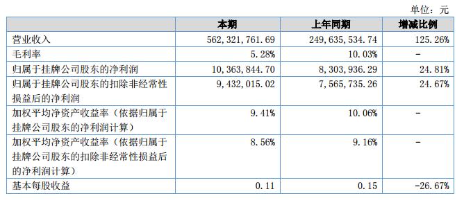 報告期內(nèi)公司實現(xiàn)營業(yè)收入5.62億元,較上年同期同比增長125.26%;公司實現(xiàn)凈利潤1036.38萬元,較上年同期同比增長24.81%。?