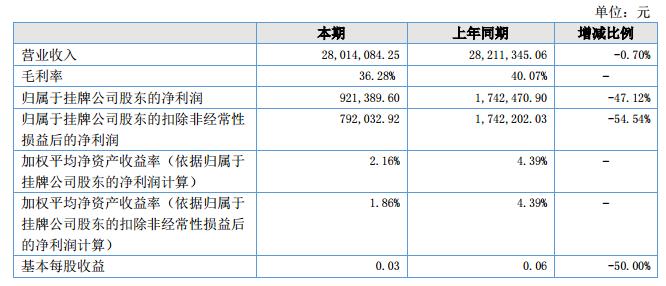 報(bào)告期內(nèi)公司營(yíng)業(yè)收入為2801.41萬(wàn)元,較上年同期減少0.70%;公司凈利潤(rùn)為92.14萬(wàn)元,較上年同期減少47.12%?。