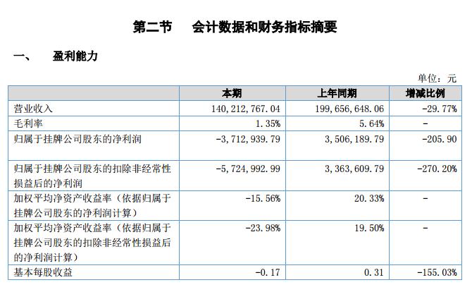 2、報(bào)告期內(nèi),歸屬于母公司的凈利潤(rùn)為-3,712,939.79 元,毛利潤(rùn)為 1,891,966.97 元,毛利率為 1.35%,主要原因?yàn)槊蕿?1.54%的運(yùn)輸服務(wù)業(yè)務(wù)占總收入的 99.63%。