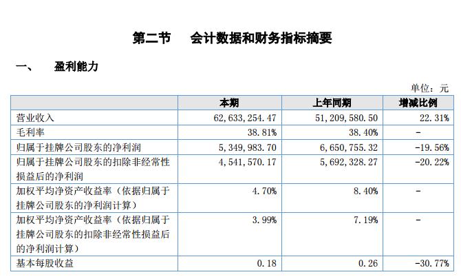 報告期內(nèi),公司實現(xiàn)營業(yè)收入 62,633,254.47 元,較去年同期增加了 11,423,673.97 元,增長率為 22.31%,主要隨著公司業(yè)務實力和品牌知名度的提升,公司業(yè)務規(guī)模得以提升,營業(yè)收入得到提高,其中主要是地理信息數(shù)據(jù)庫業(yè)務的規(guī)模擴張。報告期內(nèi)公司營業(yè)成本為 38,325,290.12 元,較去年同期增加 6,779,624.32 元,增長率為 21.49%,主要系公司規(guī)模擴大,業(yè)務量增加,營業(yè)成本相應提高所致。歸屬于掛牌公司股東的凈利潤 5,349,983.70 元,較去年同期下降 1,300,771.62 元,降低 19.56%,主要是本期公司按照《企業(yè)會計準則 11 號——股份支付》的規(guī)定進行會計處理,確認股份支付的金額為 4.5 元/股,合計 540 萬元,股份支付的部分計入損益及資本公積。