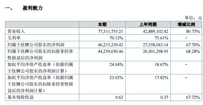 上半年,公司總資產(chǎn) 235,241,991.31 元,較上年同期增長 24.26%;歸屬于掛牌公司股東的凈資產(chǎn) 170,559,182.07 元,較上年同期增長 0.96%;報告期內(nèi),共實現(xiàn)營業(yè)收入 77,511,755.21 元,較上年同期增長 80.73%,歸屬于掛牌公司股東的凈利潤 46,215,239.42 元,較上年同期增長 67.70%;經(jīng)營活動產(chǎn)生的現(xiàn)金流量凈額為 43,231,765.87 元,較上年同期增長 100.20%。2018 年上半年,公司營收、利潤和資產(chǎn)規(guī)模均實現(xiàn)大幅增長,取得了良好的經(jīng)營業(yè)績,這主要得益于 2017 年度公司在全國范圍內(nèi)加大業(yè)務(wù)布局力度,銷售人員和項目操作人員數(shù)量均大幅增長,客戶數(shù)量進一步增加,在手訂單量充足,公司品牌影響力和市場口碑進一步提升,這為 2018 年上半年公司的業(yè)績爆發(fā)打下了良好基礎(chǔ)。