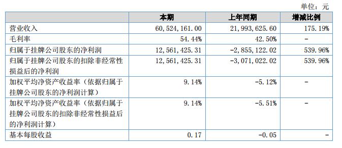 報告期內(nèi),公司實現(xiàn)營業(yè)總收入6,052.42萬元,同比增長175.19%;綜合毛利率54.44%,相比2017年同期提高11.94%;公司實現(xiàn)歸屬于母公司所有者的凈利潤1,256.14萬元,同比增長539.96%。