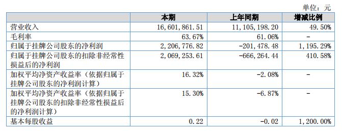 報(bào)告期內(nèi),公司實(shí)現(xiàn)營(yíng)業(yè)收入1,660.19萬(wàn)元,較上年同期增長(zhǎng)49.50%;實(shí)現(xiàn)凈利潤(rùn)206.18萬(wàn)元,較上年同期增長(zhǎng)1,123.35%。截至報(bào)告期末,公司經(jīng)營(yíng)活動(dòng)產(chǎn)生的現(xiàn)金流量?jī)纛~521.78萬(wàn)元,較上年同期增長(zhǎng)780.19%。?