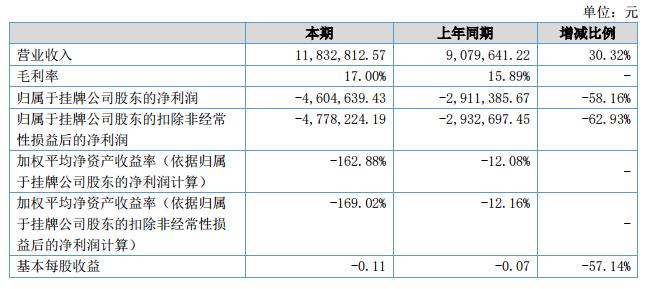 報(bào)告期內(nèi)公司實(shí)現(xiàn)銷(xiāo)售收入1,183.28萬(wàn)元,比去年同期相比增長(zhǎng)30.32%,營(yíng)業(yè)成本982.09萬(wàn)元,比去年同期相比增加8.16%,成本增長(zhǎng)相對(duì)較少,產(chǎn)品毛利率17.00%,與去年同期相比增長(zhǎng)6.99%。公司總資產(chǎn)為9,436.35萬(wàn)元,比去年期末下降7.22%,凈資產(chǎn)為52.46萬(wàn)元,比去年期末下降89.77%。資產(chǎn)負(fù)債率為99.37%?。