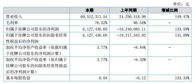 報告期內(nèi),公司營業(yè)收入為60,512,311.54元,相對于去年同期上升149.47%;營業(yè)成本為14,210,615.87元,較上年度上升335.28%;凈利潤為6,127,436.60元,較上年度上升133.59%。?