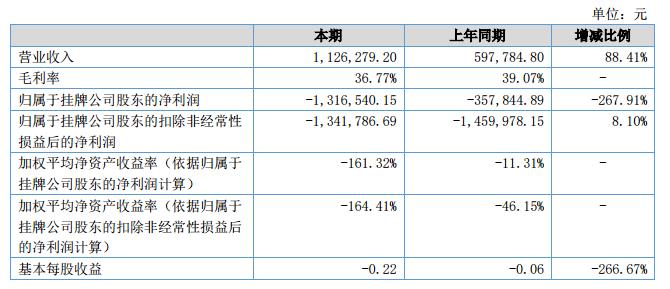 公司報(bào)告期內(nèi)實(shí)現(xiàn)營(yíng)業(yè)收入112.63萬(wàn)元,比去年同期增加52.85萬(wàn)元,增加了88.41%;實(shí)現(xiàn)營(yíng)業(yè)成本71.22萬(wàn)元,比去年同期增加34.79萬(wàn)元,增加了95.52%;實(shí)現(xiàn)凈利潤(rùn)-131.65萬(wàn)元,比去年同期減少95.87萬(wàn)元,減少了267.91%。實(shí)現(xiàn)現(xiàn)金及現(xiàn)金等價(jià)物凈增加額2.64萬(wàn)元,較上年同期現(xiàn)金及現(xiàn)金等價(jià)物凈增加額-20.49萬(wàn)元,增加了112.89%。?