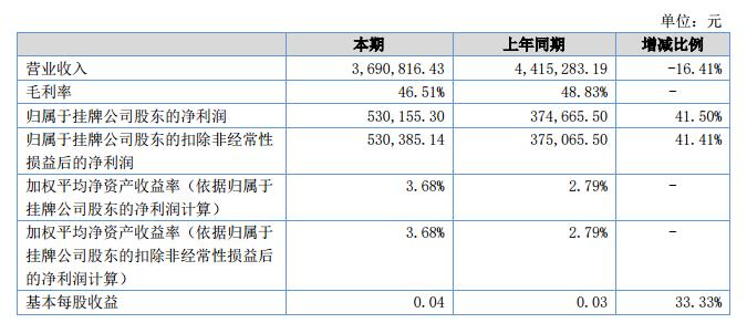 報告期內(nèi)公司營業(yè)收入3,690,816.43元,比上年同期實現(xiàn)營收增長-16.41%;公司實現(xiàn)凈利潤530,155.30元,比上年同期實現(xiàn)的凈利潤374,665.50元增加了155,488.80元,增長率為41.50%?