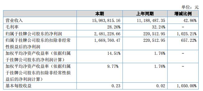 報(bào)告期內(nèi),公司實(shí)現(xiàn)營業(yè)收入1,598.38萬元,較上年同期1,118.85萬元同比增長42.86%;實(shí)現(xiàn)凈利潤248.12萬元,較上年同期22.05萬元同比增長1,025.21%。?