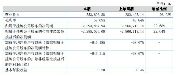 報告期內(nèi),公司營業(yè)收入為553,606.88元,較上年同期增長了96.02%;凈利潤情況:報告期末,凈利潤為-3,796,009.14元,同比增長22.68%。