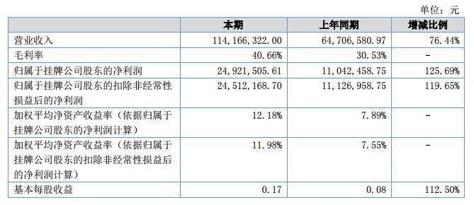 報(bào)告期內(nèi),營業(yè)收入114166322元,較去年同期增長76.44%;毛利率39.69%,同比上升9.16%;凈利潤24,921,505.61元,同比增長125.69%。?