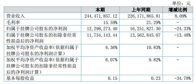 報告期內,公司實現(xiàn)營業(yè)收入244,471,857.12元,與上年同期相比增長8.09%;營業(yè)成本206,352,916.78元,與上年同期相比增長15.92%;實現(xiàn)凈利潤15,172,501.87元,與上年同期相比下降22.67%。?