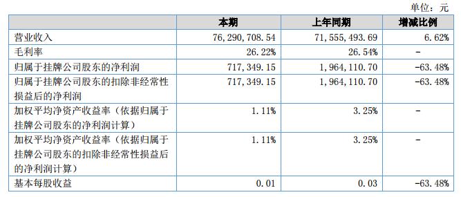 公司在報(bào)告期內(nèi)的主營業(yè)務(wù)收入為7629.07萬元,比上年同期增長6.62%;營業(yè)成本為5256.78萬元,比上年度增長7.08%;歸屬于母公司的凈利潤為71.73萬元,比上年同期下降63.48%。?