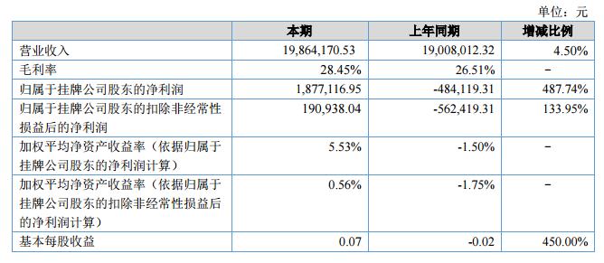 報告期,實現營業(yè)收入19,864,170.53元,較上年同期增長4.50%;實現凈利潤1,877,116.95元,較上年同期增長487.74%,凈利潤增幅較大,主要是報告期收到新三板掛牌獎勵基金200萬元。?