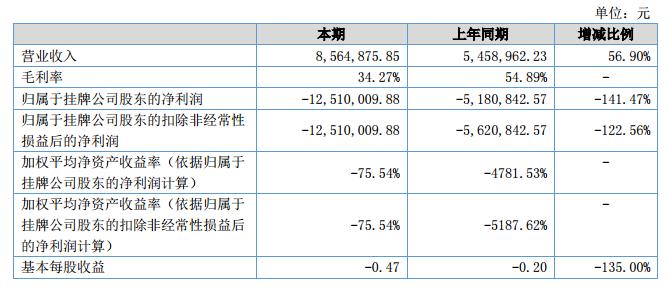 報(bào)告期內(nèi)公司實(shí)現(xiàn)收入8,564,875.85元,較2017年同期增長(zhǎng)56.90%;凈利潤(rùn)為-12,510,009.88元,較2017年同期虧損增加141.47%。?