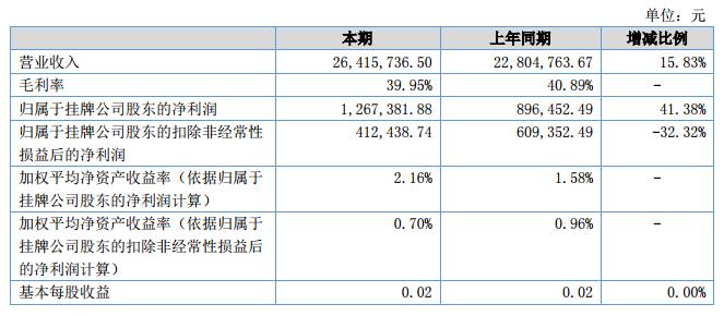 報告期內(nèi)公司實現(xiàn)營業(yè)收入26,415,736.50元,較2017年上半年增長了15.83%;營業(yè)成本15,862,868.27元,較2017年上半年增長了17.68%,主要系公司改變銷售戰(zhàn)略,多向客戶爭取訂單所致;凈利潤1,267,381.88元,較2017年6月上漲41.38%,主要原因是本期政府補助收益增加所致。?
